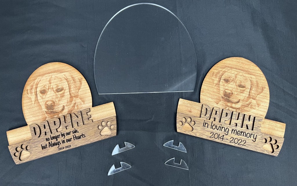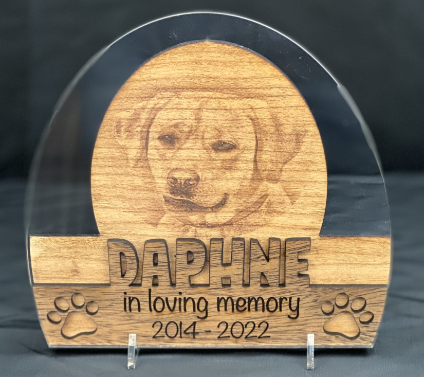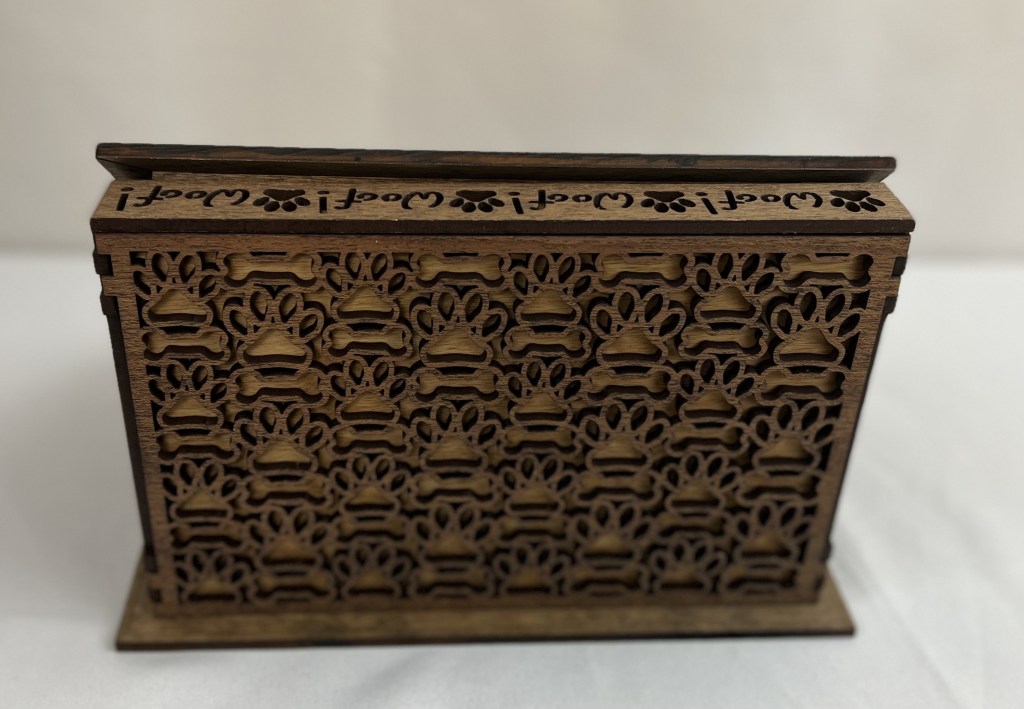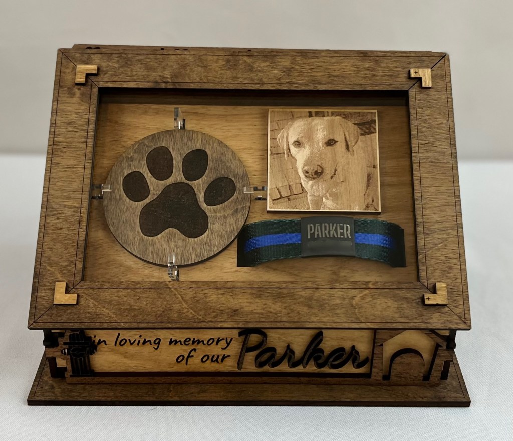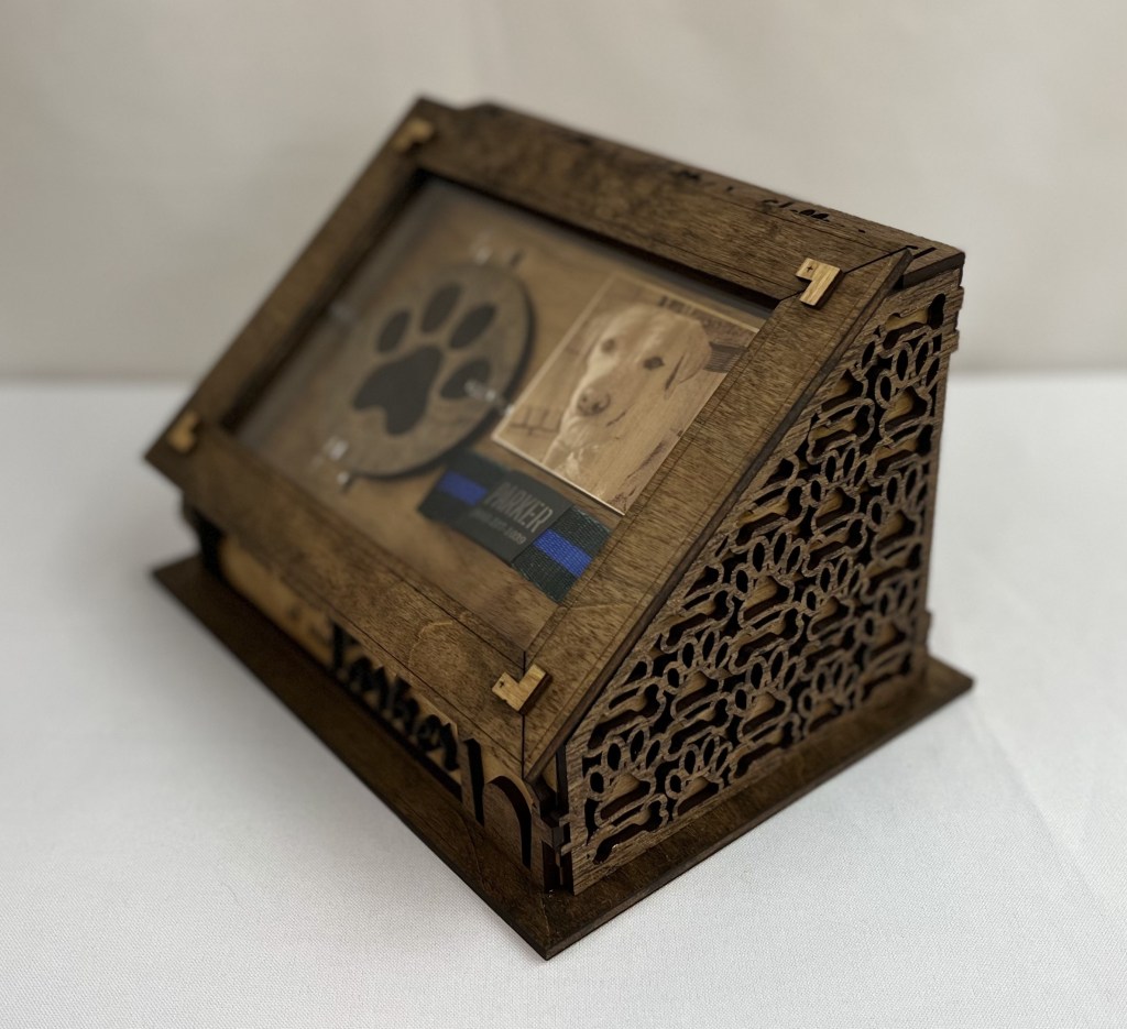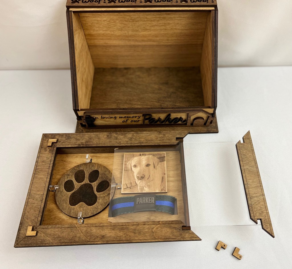 Memorial Shadow box with storage base (can be used as an urn). Full interior is approximately 90 cubic inches (general rule is 1 cubic inch needed for every 1 pound). Measurements are approximately 9.5″W x 6.75″D x 5.75″H. Configured to hold a 1/2″-3/4″ collar and up to 3.5″ clay paw print (or a generic wood engraved one cane be added). Price includes name personalization on the front of the box. You can add your own photo or for an additional cost a wood engraved photo can be made of your pet.